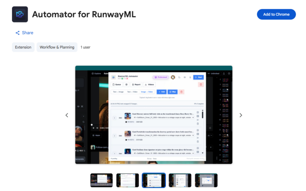 Automator for RunwayML is available as a Chrome extension with in-app purchases. Since it automates your existing RunwayML account, you’ll still need an active RunwayML subscription to generate content.